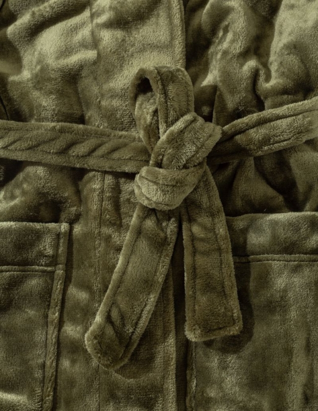 En riktigt mjuk och skön morgonrock från Trofe. Slutar strax över ankeln, beroende på hur långa man är. Snygg mörkgrön färg.