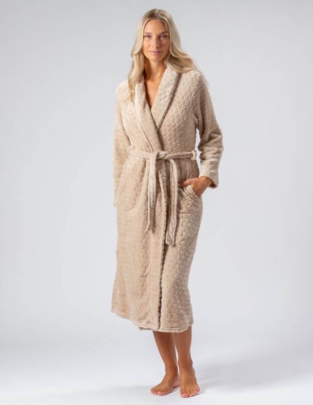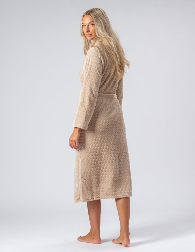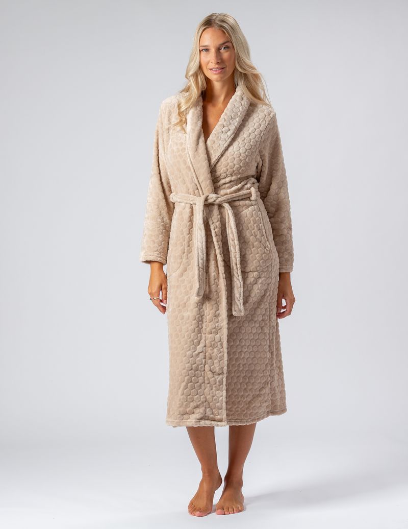 En riktigt mjuk och skön morgonrock från Trofé. Slutar strax över ankeln, beroende på hur långa man är. Snygg beige färg med ett bubbelmönster i tyget.